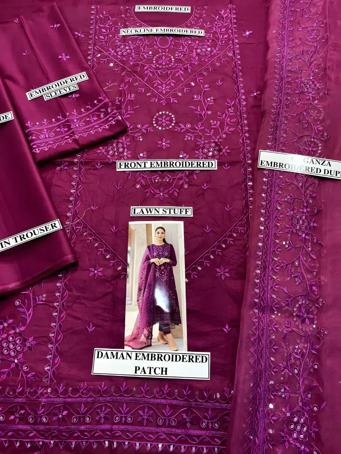 *Lawn front with HEAVY embroidered With HEAVY SEQUENCE WORK**Embroidered lawn sleeves WITH SEQUENCE WORK**Daman Embroidered Patch WITH SEQUENCE WORK**Organza Embroidered Dupatta WITH SEQUENCE WORK*